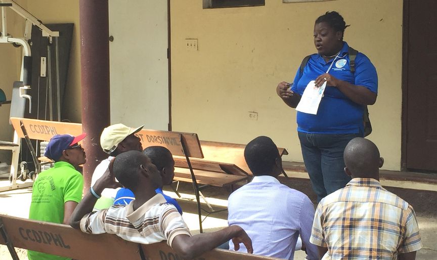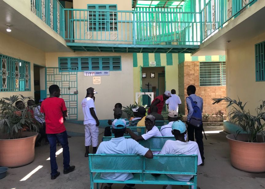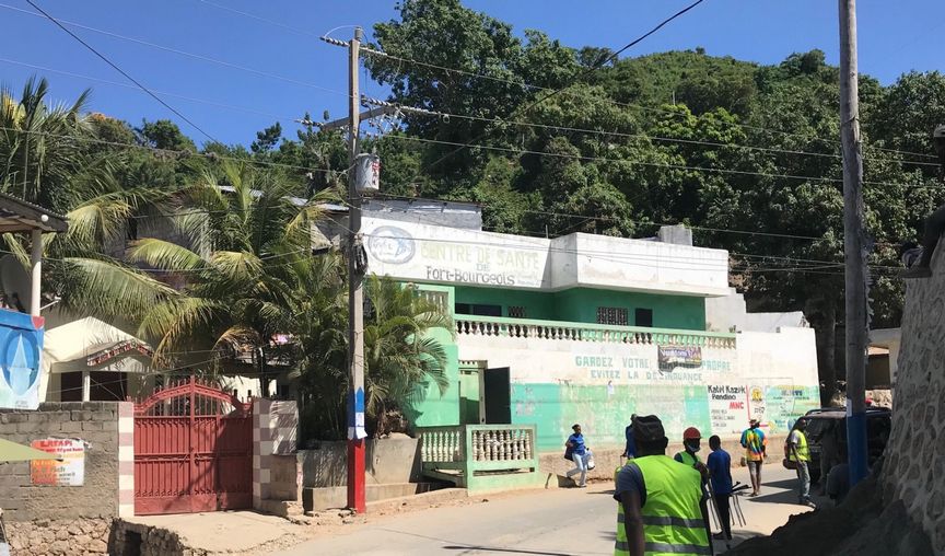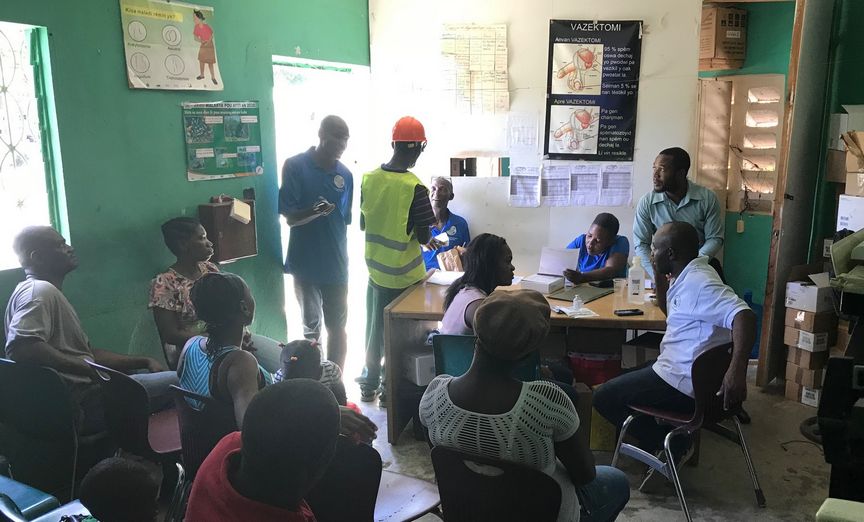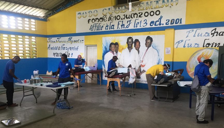 The whole team reunites at the Dugue Clinic, also in Plaine-du-Nord. Patients waiting, sharing ideas and techniques, and training Dr. Dugue.