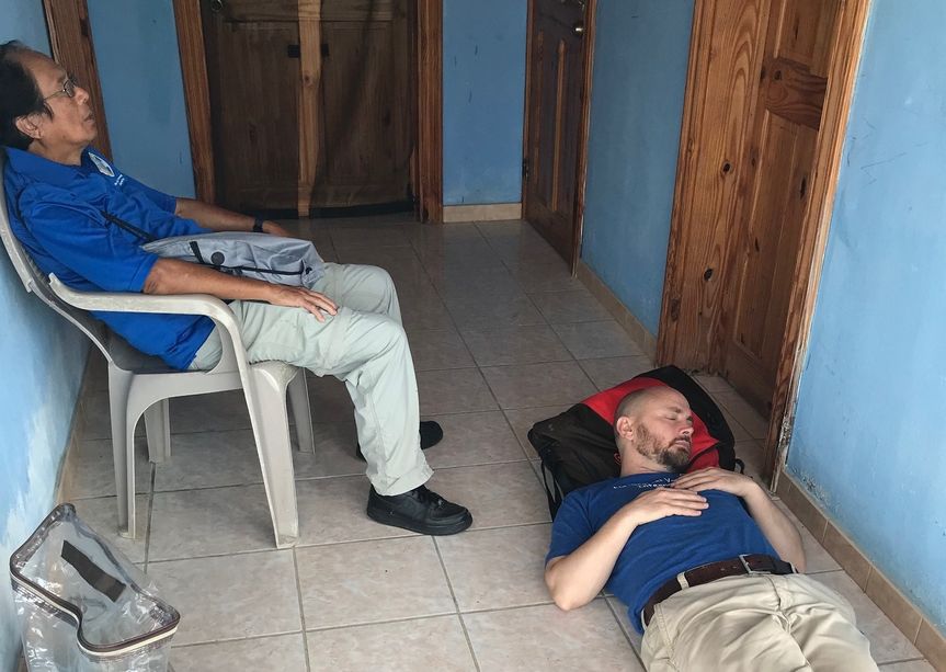 Friday: A group photo while we are all fresh. No patients at Clinique Esperance in Terrier Rouge, so time for a quick snooze while Doug tries to resolve administrative issues.