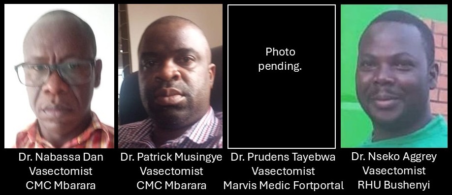 Vasectomy is offered by a number of NSVI-sponsored teams in Uganda. Dr. Ssenyonjo is based in Kampala at RHU Katego, but sometimes travels to othe locations to provide vasectomies or help other providers. Mr. Mubakali supervises all locations on vasectomy days to ensure full informed consent and to make sure that clinics run smoothly and safely. Ms. Nabwire handles scheduling, coordination, and payments to facilities and support personnel.
